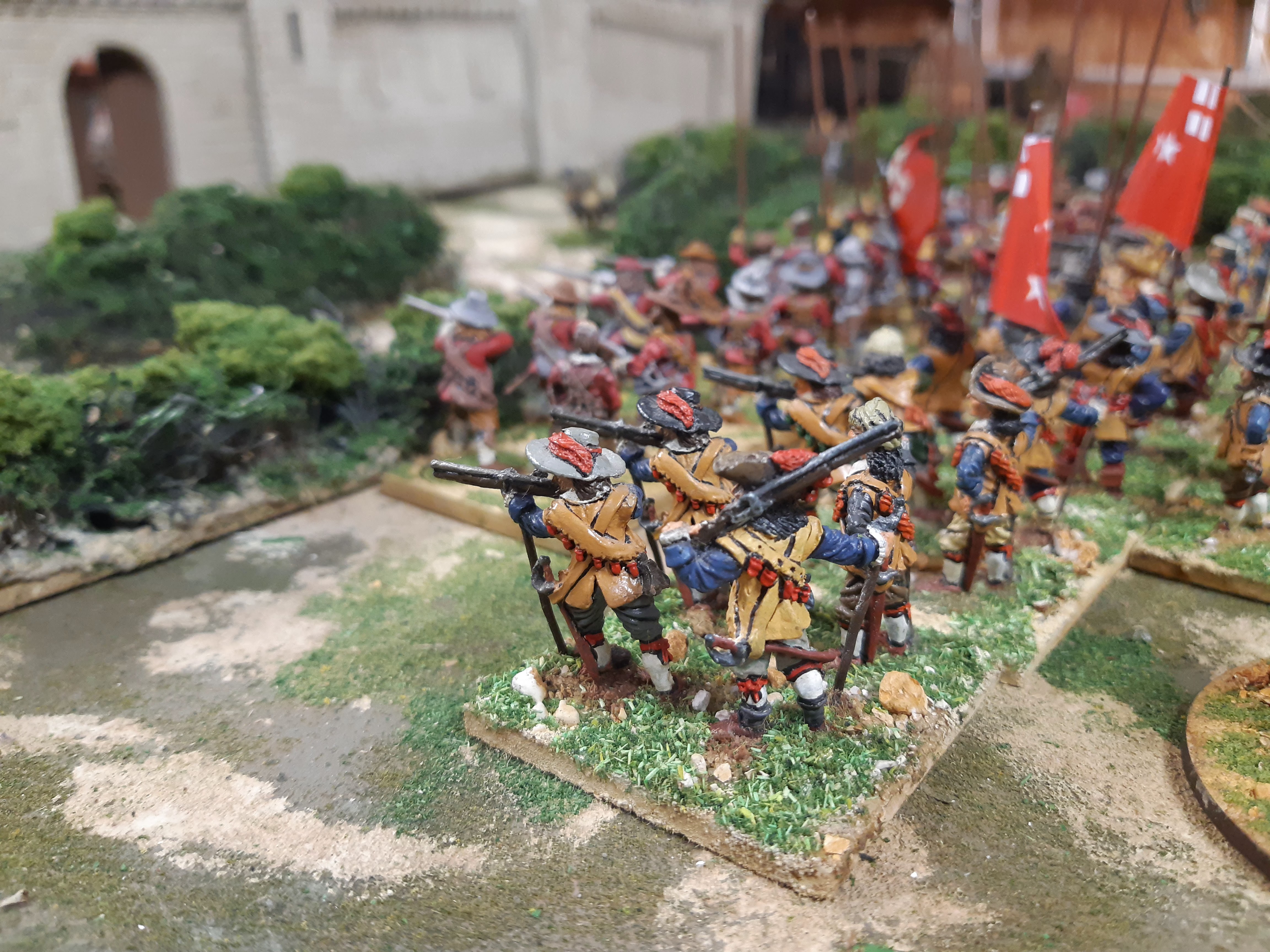 I or Rupert, managed to lose the entire right wing of cavalry pretty much,the left wing was just a bit too congested, I did manage to blow both a hole with a petard and destroy the damaged section of wall with some point blank artillery but by the time that had happened there wasn't time to mount a proper assault and gain entry to qualify for a win within the eight turns, so it was a Covenanter win. It was all great fun and nice to get the city walls out for a first game, we will have another go on a larger table and this time include rules for ladders probably eliminate artillery if they're on a section of the wall when it explodes! I need to finish some artillery off for the period and a petard team and of course I want some half timbered town houses as I was forced to use Italian and dark age buildings as the farm /village buildings take up too much space. Next up a finished off pike and shot unit or something Napoleonic.